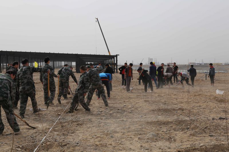 在库车经济技术开发区福洋路南侧植树现场,林业部门技术人员讲解完植树流程和注意事项后,干警们热情饱满,积极发扬不怕苦不怕累的精神,拿起铁锹,挖坑植苗、铲土入坑、培实新土,大家严格按照种植的方法,将杏树苗一颗颗植入挖好的树坑中,经过干警们的默契配合,圆满地完成了植树任务。